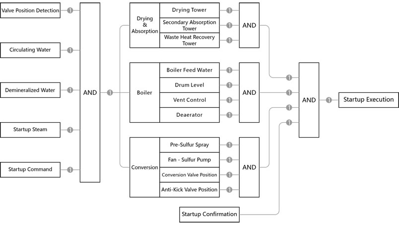 Sulfur acid making device driving is a complex and long process, in this process involves the order of driving preparation, the adjustment of process parameters, the setting of the control valve on the device, and the confirmation of all conditions before starting the fan to spray sulfur driving, because the driving process is the process of the device from static to dynamic process process parameters will change dramatically. Accidents can occur when the device is not properly prepared, so it is necessary to control the driving process safely. Based on the change of driving process, it is very important to design a set of perfect and reasonable control logic.