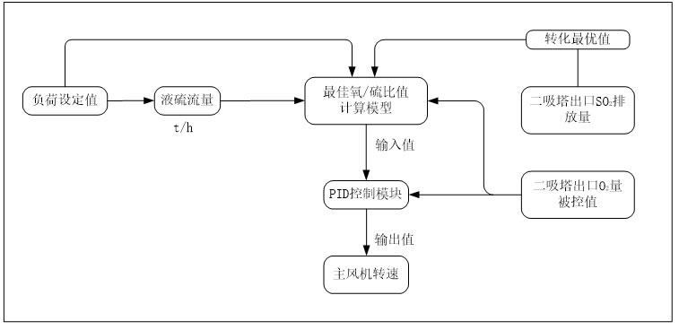 Through the analysis of Figure 2, we can find that the key to realize the automatic control of oxygen-sulfur ratio lies in the selection of appropriate two process variables: SO2 concentration at the outlet of sulfur burning furnace and O2 concentration at the outlet of secondary suction tower. As a fixed load value, the liquid sulfur flow rate is accurately and stably measured by mass flowmeters. However, the measurement of SO2 concentration at the outlet of the furnace presents some challenges, the main problem being the presence of SO3 in the flue gas (actual content between 0.2 and 0.5%), which significantly increases the risk of analyzer damage. Relatively speaking, the flue gas at the exit of the second suction tower contains only a very small amount of acid fog (30mg/m³). And SO2 (content of 500ppm), therefore, the flue gas to the secondary suction tower outlet oxygen analyzer is gentler, can ensure the stability of the measurement. In view of these factors, the selection of the process variable of the O2 ratio automatic control is more inclined to the O2 concentration value at the exit of the secondary suction tower. The specific operation steps of automatic control of oxygen sulfur ratio can be referred to Figure 3.