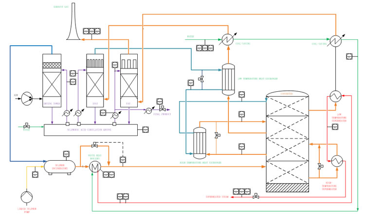 Large-scale production of sulfuric acid is mainly through two methods: smelting flue gas acid production and sulfur acid production. Acid production from smelting flue gas uses sulfur dioxide (SO2), a by-product of smelting process, to maintain the required temperature of the system through the heat released by the conversion reaction. In this process, the key controls include the purification of the flue gas, the conversion of sulfur dioxide and the absorption of sulfur trioxide (SO3). Sulfur acid, on the other hand, produces sulfur dioxide by burning liquid sulfur, and releases a lot of heat, and then uses waste heat boilers to remove the heat in the flue gas to produce superheated steam. The flue gas then passes through a converter and an absorber to complete the acid production process. Although flue gas acid production and sulfur acid production both use the same sulfur dioxide conversion and sulfur trioxide absorption processes, they differ in raw material generation and the use of waste heat boilers. There is no dangerous chemical reaction and high temperature and high pressure environment in the purification process control flow of smelting flue gas to make acid. In contrast, sulfur acid production will produce high temperature flue gas and medium pressure superheated steam during the generation of sulfur dioxide, which makes its automatic control more difficult than smelting flue gas acid production. Therefore, the automatic operation of sulfuric acid plant discussed in this paper is illustrated by taking sulfur acid making plant as an example. The process flow chart is shown in Figure 1