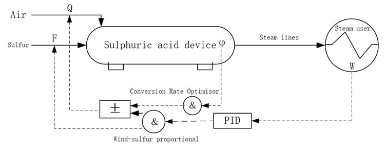 The production load of sulfur acid is generally stable, and the operating load is adjusted only when there is a significant fluctuation in the steam load. Therefore, automatic load control is mainly adjusted according to the downstream steam demand load. When the automatic operating system receives the downstream load adjustment instruction, it will automatically adjust the operating load of the device. Figure 2 shows how this automatic load control can be run. The steam user W issues a load command, controls the target through the PID controller output, and regulates the flow of sulfur F and air Q. The wind proportioner distributes wind according to different load requirements to achieve the most economical operating efficiency. By conversion rate φ The optimizer adjusts the air volume of the current load to achieve the best balance of conversion and economic efficiency.