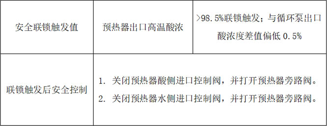 When water leakage occurs inside the preheater, it can be found in time that water leakage occurs in the preheater, and the safety interlock is triggered after the sulfuric acid concentration is lower than the safe value and is restored to the safe state. This protects the back-end equipment from severe corrosion.