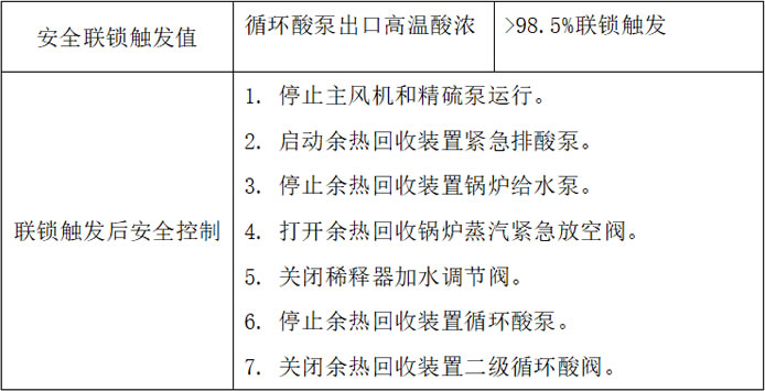 Please note that in the event of a failure of the high temperature acid concentration meter at the outlet of the circulating acid pump, it must be repaired and restored to normal operation within 4 hours, during which time the interlock can be temporarily removed. During meter repair, the acid concentration at the outlet of the circulating pump should be manually analyzed every 30 minutes. At the same time, other safety interlocking measures of the waste heat recovery device shall not be removed.
