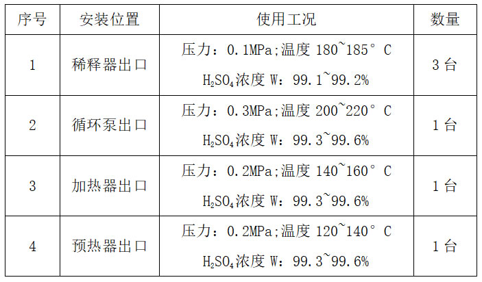High temperature sulfuric acid concentration analyzer at the outlet of circulating acid pump (design 1 high temperature sulfuric acid analyzer) for measuring the following conditions: