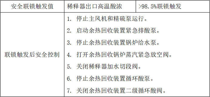 When there is a serious leak inside the sulfuric acid unit or the waste heat recovery unit, or the diluter water acid concentration control fails, resulting in the sulfuric acid concentration inside the waste heat recovery unit falling below the safe value, the safety interlock system will be triggered to shut down the unit and restore it to a safe state. This measure is designed to protect the device from major corrosion and prevent the company from shutting down for a long time.