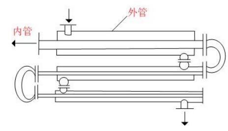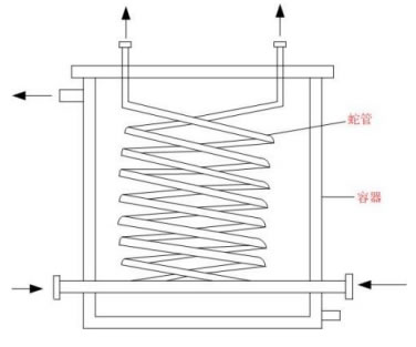 The snake tube is mostly bent and wound by a metal tube, and the two fluids are immersed in the container and flow inside and outside the tube respectively.