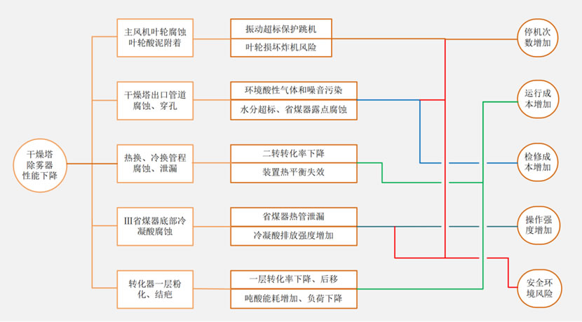 When the drying tower demister carries acid, it will cause corrosion of downstream pipelines and equipment (including the abrasion of the downstream fan impeller with acid), so the operation rate of the acid making device will inevitably decrease. Repeated sealing of downstream heat and cold heat exchangers will increase the number of operations in confined Spaces and also increase safety risks. [1]