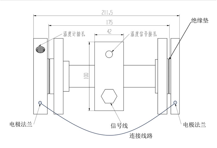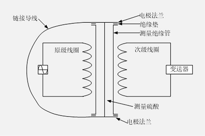 The conductivity sensor is composed of a probe head, a signal cable, a temperature compensation thermocouple, a measuring tube and its connecting flange; The probe head uses two coils, one as a transmitter and the other as a receiver, and uses a protective box to completely isolate the environmental and process fluids. When the transmitter coil is energized, sulfuric acid conducts electricity to generate an induced current, and the induced current is proportional to the conductivity of sulfuric acid, and the receiver coil detects the size of the current output by the signal cable to the transmitter, thus calculating the concentration of sulfuric acid; Due to the high temperature sulfuric acid is highly corrosive, coupled with the insulation material can not withstand high temperature, the two coils can not be directly immersed in contact with sulfuric acid, so the measuring probe is installed on the measuring tube lined with PTFE; In order to operate normally, the electrode flanges at both ends of the sensor need to be connected with wires. When sulfuric acid flows through the measuring tube, a conductive loop is formed, as shown in Figure 1.