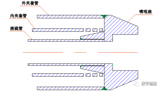 The nozzle is sealed with thread line, which realizes that there will be no liquid sulfur leakage in 800 ℃ high temperature cold and heat shock. In order to reduce the probability of weld leakage in the sulfur burning furnace, there is only one weld in the gun body through clever design, and through the stress relief design, the weld can be effectively prevented from tearing due to stress concentration. The finite element stress analysis of the weld of the steam insulation sleeve can be seen that the stress at the weld of the steam insulation sleeve is very low