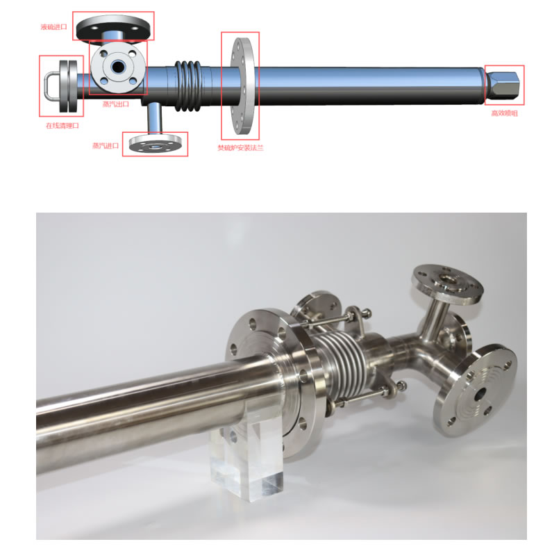 Sulfur acid-making plants often have their sulfur gun nozzles clogged by foreign substances, iron sulfide and impurities, which forces the plants to stop and replace the sulfur guns. Each shutdown causes at least a 4-hour production interruption. Therefore, the online cleaning technology of the sulfur gun is particularly important. We have achieved the online cleaning of the high-efficiency sulfur gun by optimizing its structure. After the structural improvement, since the liquid sulfur inlet is located on the side of the sulfur gun, when disassembling and installing, only the bolts need to be directly removed to take off the sulfur gun. There is no need to disassemble part of the liquid sulfur pipeline of the sulfur burning furnace as in traditional sulfur guns to remove the sulfur gun from the furnace. This design offers a more convenient installation and disassembly method, reducing the installation time of the sulfur gun from 2 hours to 30 minutes. The following is a schematic diagram of the fourth-generation online cleaning high-efficiency sulfur gun: