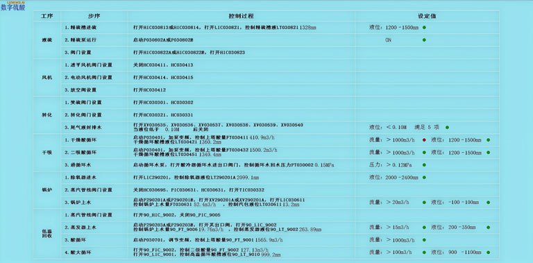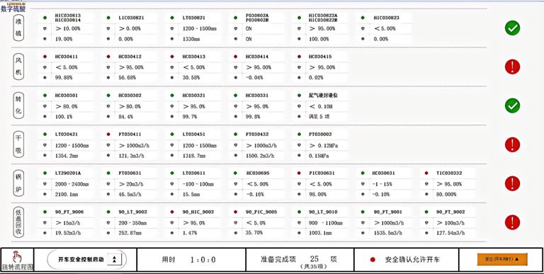 Our startup navigation screen transforms this highly complex process into a visual and error-proof standardized procedure. For different processes, the entire startup process is decomposed. Each module lists all the startup conditions that must be met for the process. For example, in the "liquid sulfur" process, the conditions include: the opening degree of the liquid sulfur storage tank discharge valve is greater than 10%, the liquid level in the distillation underground tank is within the range of 1200-1500mm, and the sulfur pump is started, etc. Each condition is associated with real-time data from the site.